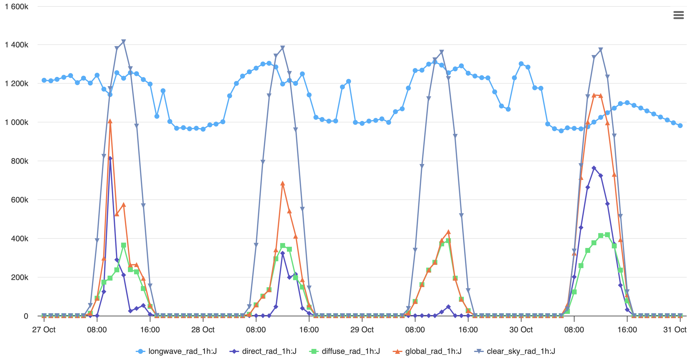 Show the longwave, direct, diffuse, global and clear sky radiation accumulated over one hour intervals for the next five days.